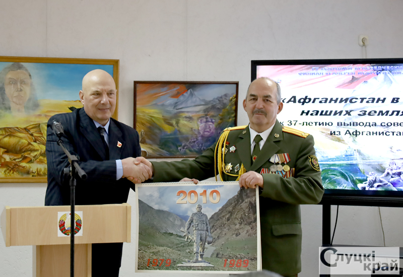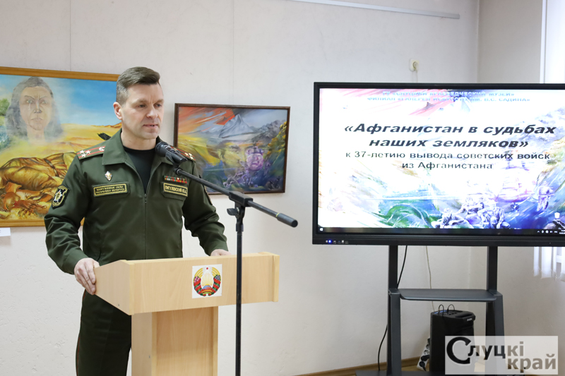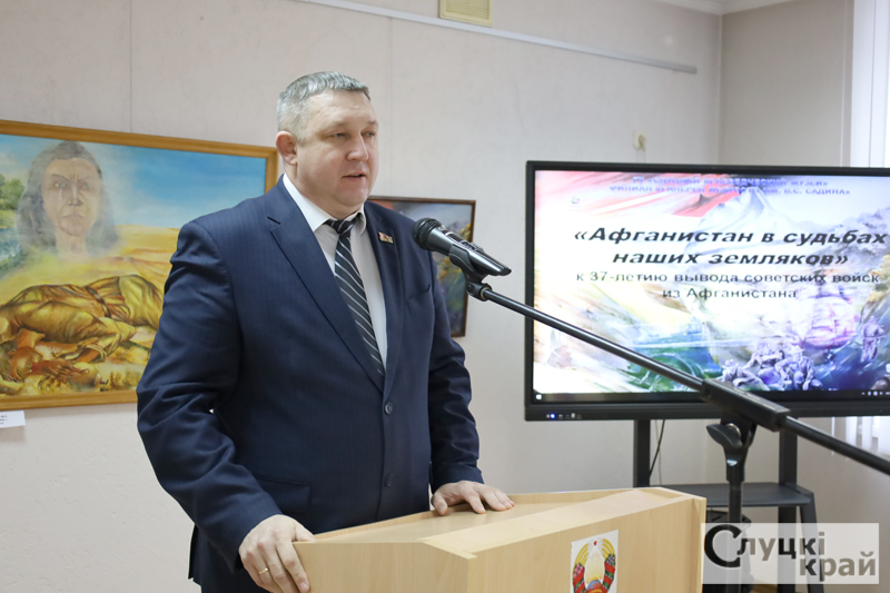 К 37-летию вывода советских войск из Афганистана в галерее искусств им. В.С. Садина открылась выставка. В торжестве приняли участие председатель Слуцкого районного исполнительного комитета Владимир Гога, его заместитель Наталья Чернушевич, председатель Слуцкого районного Совета депутатов Александр Курак, воины-интернационалисты, кадеты Минского областного кадетского училища, представители общественности.