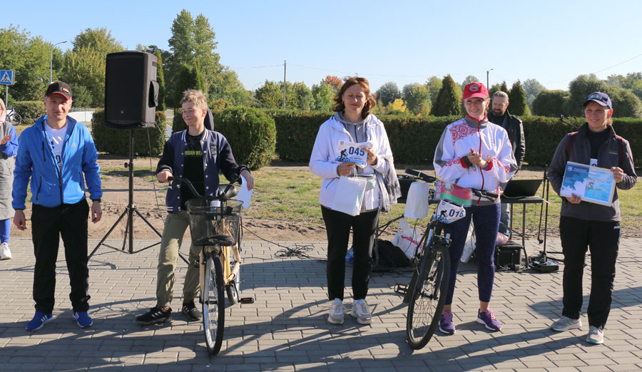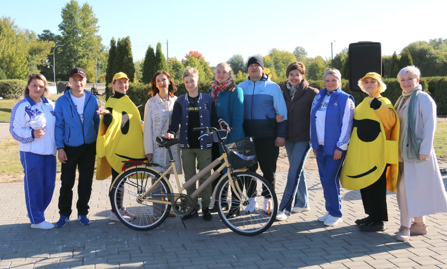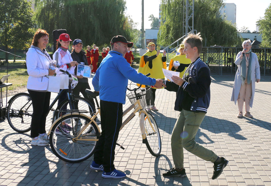 Завершился велопробег награждением его участников. Поощрили четверых человек, которые первыми финишировали, троим участникам велопробега улыбнулась удача – их номера вытянули рандомно. А суперприз – велосипед – достался Артему Трайно, ученику средней школы №13. Артём вместе с мамой, работницей налоговой инспекции, и отцом, работников универмага “Слуцк”, впервые принял участие в велопробеге. И очень даже удачно. Кстати, родители мальчика активные участники велопробегов в Слуцке.