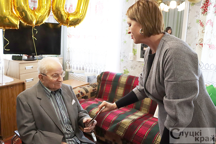 Поздравить юбиляра приехали депутат Палаты представителей Национального собрания Республики Беларусь Наталья Овсянникова, председатель Слуцкого районного Совета депутатов Александр Курак, председатель Беличского сельисполкома Екатерина Петриченко, представители отделения по гражданству и миграции отдела внутренних дел Слуцкого райисполкома, Слуцкого территориального центра социального обслуживания населения.