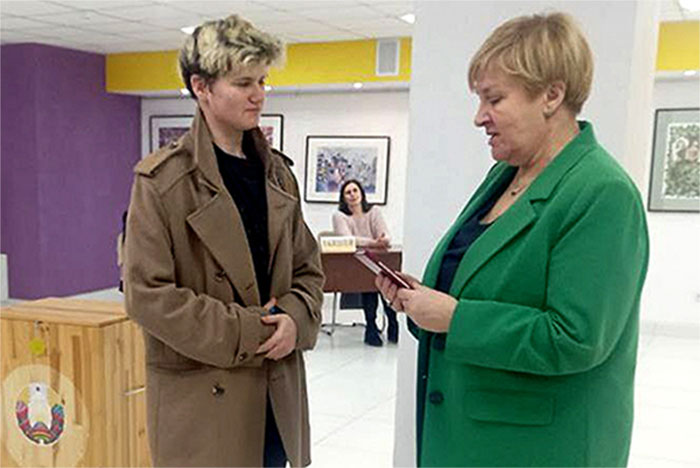 На участке для голосования №27 (районная центральная библиотека) чествовали впервые голосующих слутчан Григория Тарасевича и Ксению Ковальскую. Молодым слутчанам вручили книги Конституции Республики Беларусь, пожелали быть активными гражданами родной Беларуси и участниками общественной жизни.