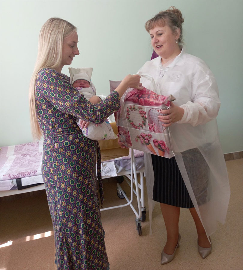 Председатель Минского областного отделения Белорусского детского фонда Галина Пронько и председатель Слуцкого районного отделения этого фонда Инесса Пономарева в Международный день защиты детей вручили подарки девяти роженицам.