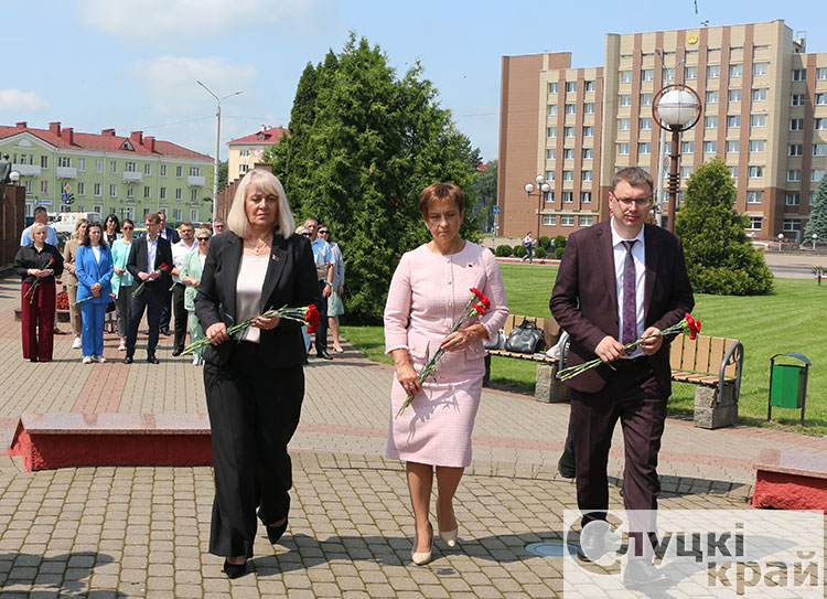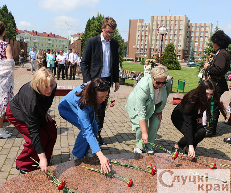 Гости почтили минутой молчания память погибших в годы Великой Отечественной войны у памятного знака воинам-освободителям, возложили цветы. Также посетили музей Слуцких поясов.