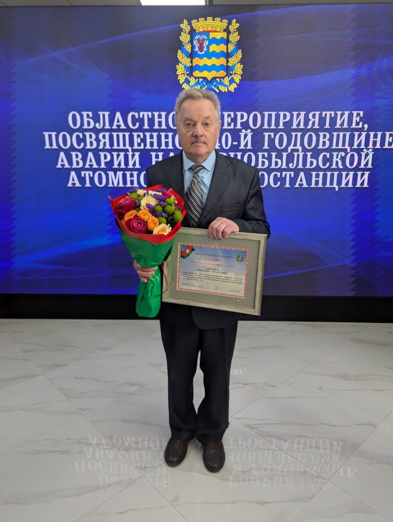 Александр Ильясевич и Наталья Якубицкая вручили награды ликвидаторам аварии на ЧАЭС от Минского областного исполнительного комитета. Благодарностью председателя Миноблисполкома отмечен Вячеслав Михайлович Аскабович, врач-методист организационно-методического кабинета Слуцкой центральной районной больницы, принимавший участие в ликвидации последствий аварии на ЧАЭС.