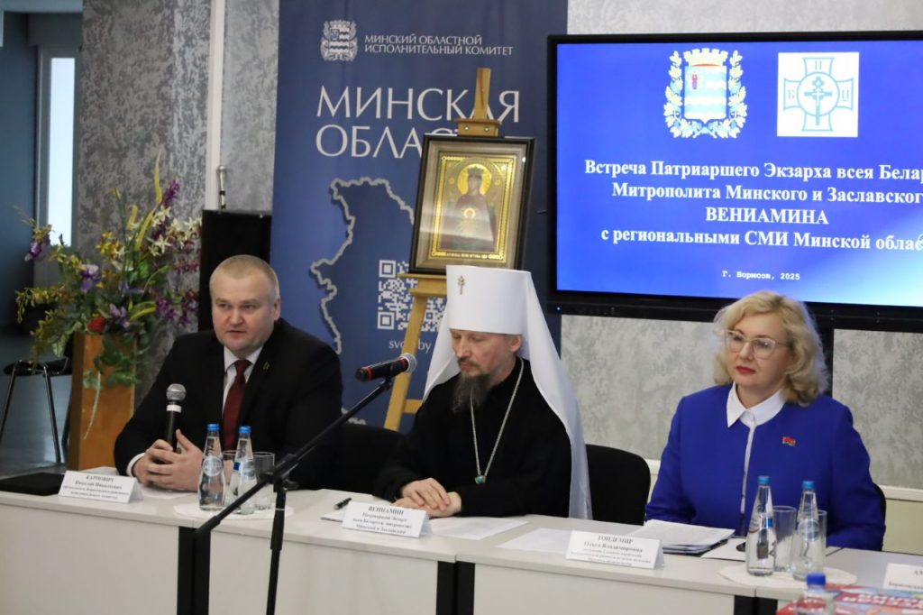 В Борисове прошла встреча Патриаршего Экзарха всея Беларуси, Митрополита Минского и Заславского Вениамина с представителями средств массовой информации Минщины.На встреча присутствовали начальник главного управления идеологической работы и по делам молодёжи Миноблисполкома Ольга Топдемир, председатель Борисовского райисполкома Николай Карпович, епископ Борисовский и Марьиногорский Амвросий, другие священнослужители.