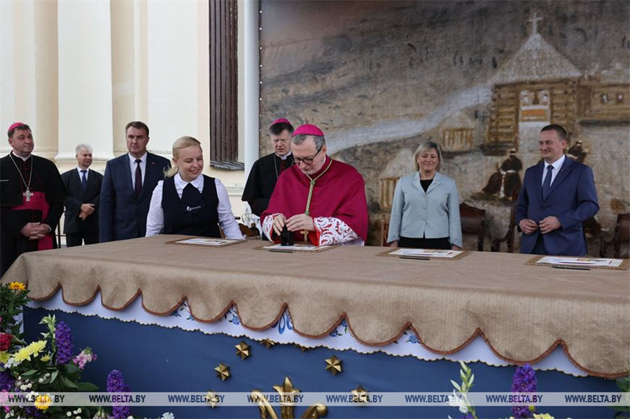 Церемония гашения государственного знака почтовой оплаты прошла на сцене у костела в присутствии гостей Будславского феста. В ней приняли участие председатель Минского областного исполнительного комитета Александр Турчин, генеральный директор РУП “Белпочта” Светлана Юркевич, митрополит Минско-Могилевской архиепархии, архиепископ Иосиф Станевский. Также на торжества в Будслав в качестве специального посланника Папы Римского Франциска прибыл префект Дикастерии по делам Восточных Церквей Святого Престола архиепископ Клаудио Гуджеротти.