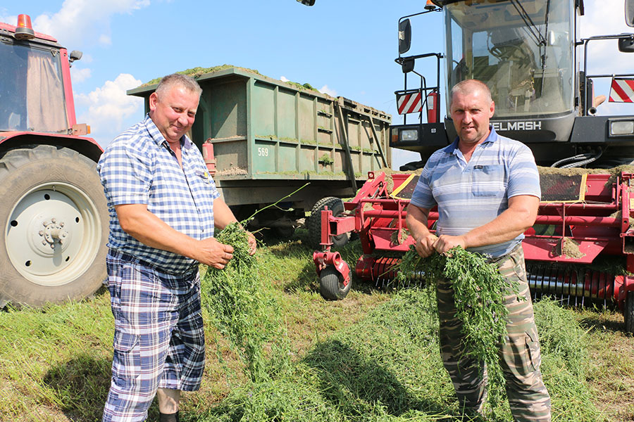– У нас остался неплохой запас прошлогоднего зерна. Потому больше площадей отвели под травы и кукурузу, чтобы получить в достатке кормов для животных. И не прогадали. Получен хороший урожай люцерны. Убираем культуру третьим укосом, будет и четвертый, – рассказывает главный агроном Дмитрий Добриян по пути в поле, где усердно трудятся механизаторы. – Планируем получить не меньше кормов, чем в прошлом году, в том числе в пересчете на условную голову животного.