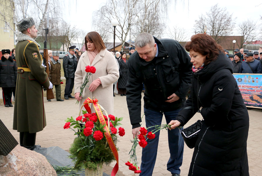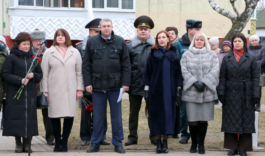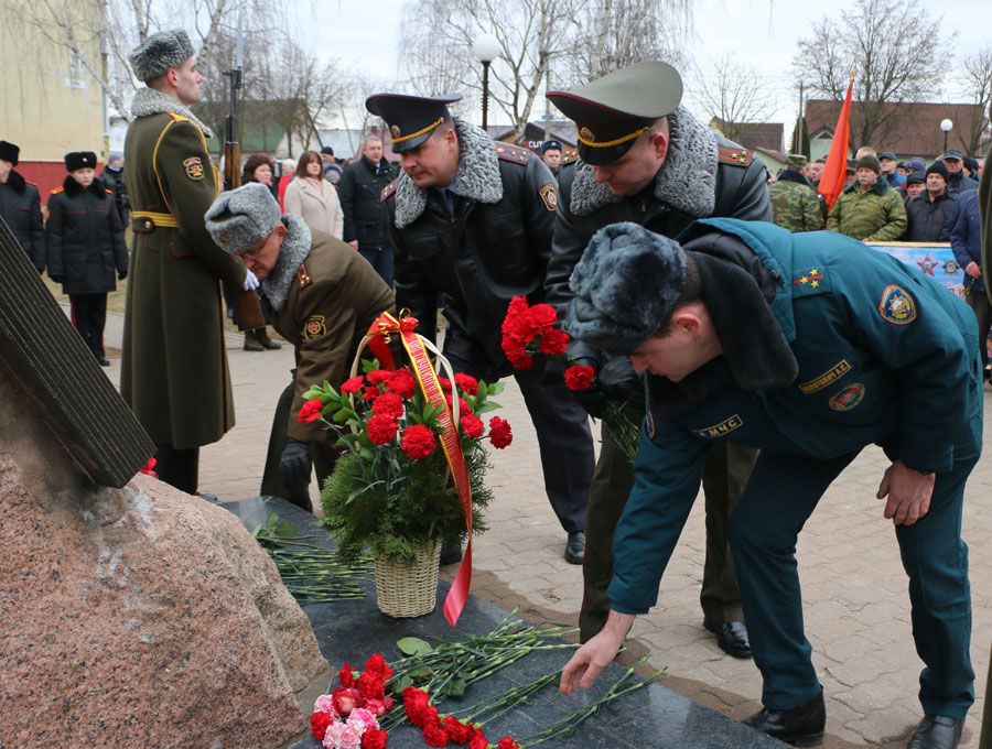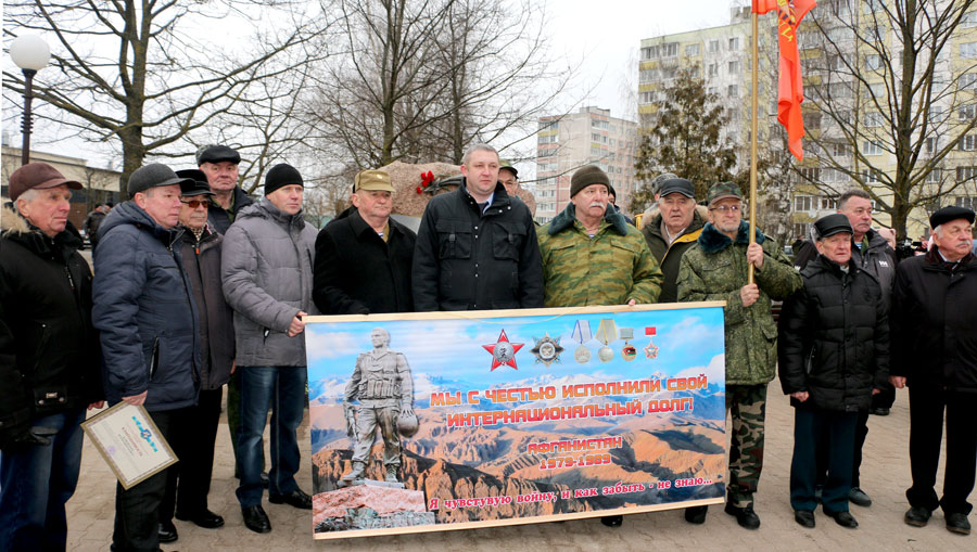 У памятного знака воинам-интернационалистам в Слуцке прошел митинг, посвященный 34-й годовщине вывода советских войск из Афганистана. В мероприятии приняли участие председатель Слуцкого райисполкома Владимир Гога, его заместители, председатель Слуцкого районного Совета депутатов Наталья Овсянникова, депутат Палаты представителей Национального собрания Республики Беларусь Валентина Ражанец, руководители структурных подразделений райисполкома, руководители предприятий, организаций города, представители силовых структур, МЧС, военнослужащие 30-й отдельной железнодорожной бригады, представители районной организации Белорусского союза офицеров, других общественных объединений, КПБ, воины-интернационалисты, горожане.