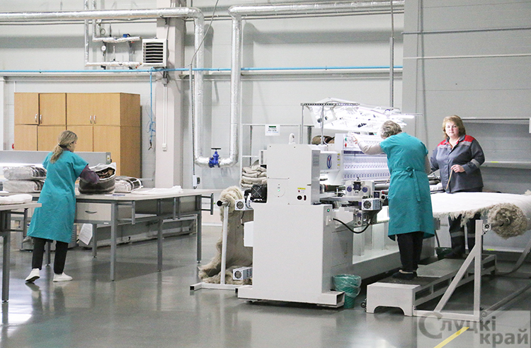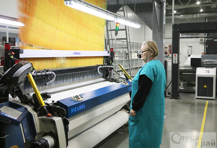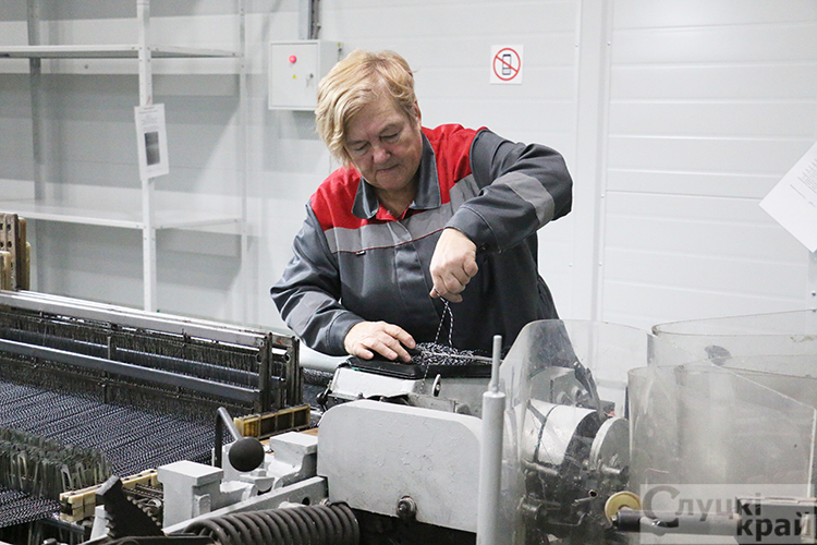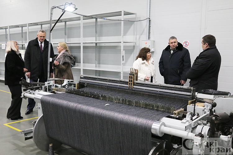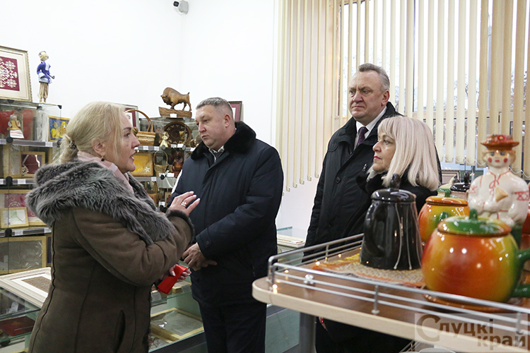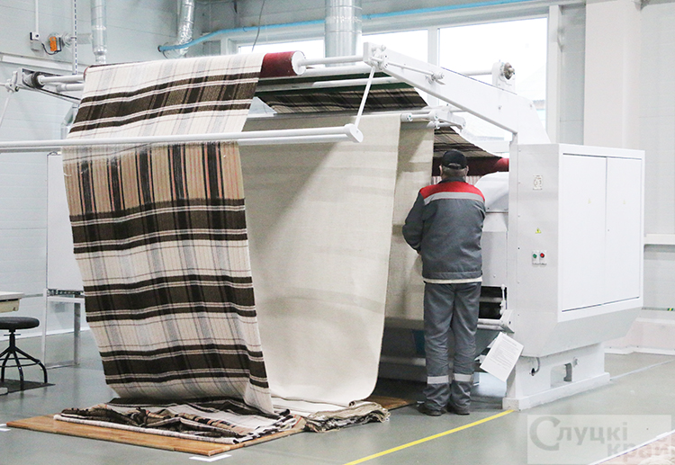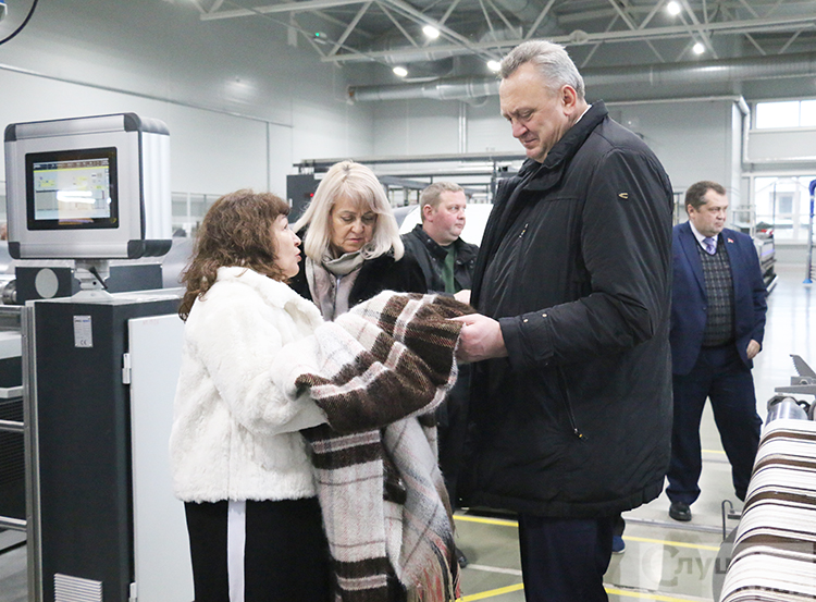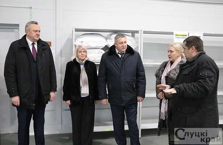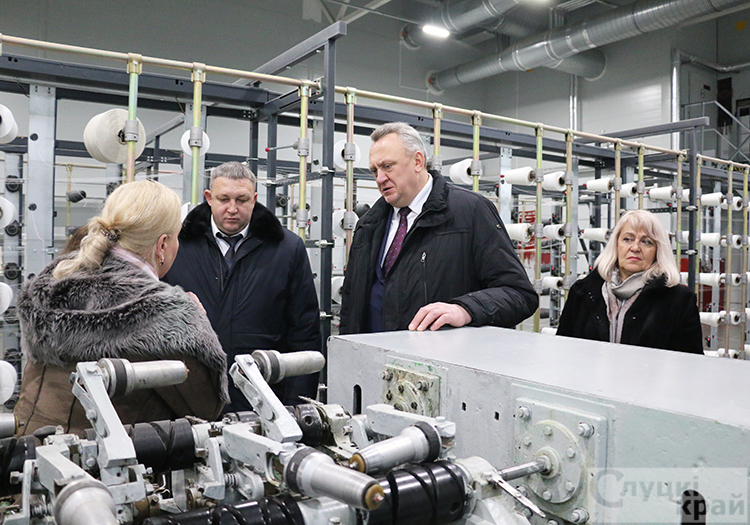 Председатель Слуцкого райисполкома Владимир Гога, гендиректор ГПТО «Белхудожпромыслы» Александр Корбут, заместитель председателя Слуцкого райисполкома Жанна Руцкая ознакомились с производством в новых цехах РУП «Слуцкие пояса» на улице Тутаринова.