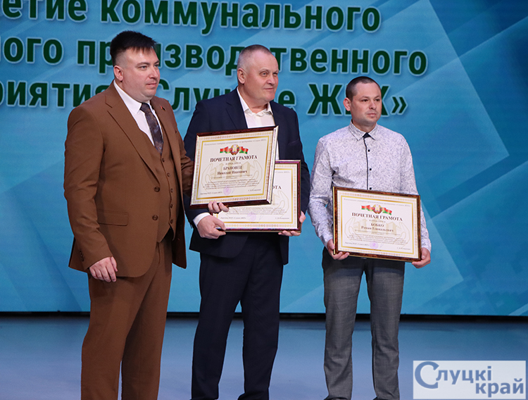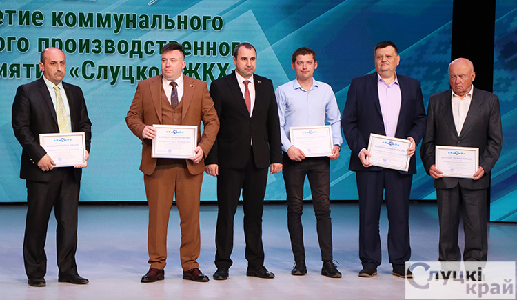 Почетными грамотами ГО «Жилищно-коммунальное хозяйство Минской области» отмечены председатель первичной профсоюзной организации КУП «Слуцкое ЖКХ» Белорусского профессионального союза работников местной промышленности и коммунально-бытовых предприятий Владимир Прохорик, водитель погрузчика цеха автотранспорта производства благоустройства Иван Ермаков, тракторист цеха автотранспорта котельного производства Андрей Добролёт, ведущий инженер-энергетик котельного производства Валентин Фурс, слесарь по обслуживанию тепловых сетей аварийно-диспетчерской службы Виталий Горбацевич, кровельщик по рулонным кровлям и кровлям из штучного материала производственного хозрасчетного цеха Владимир Гуринович, начальник аварийно-диспетчерской службы Александр Полещук.