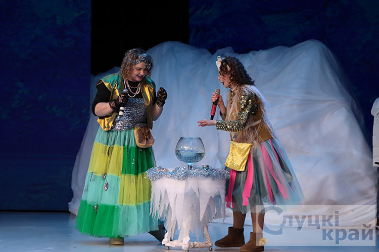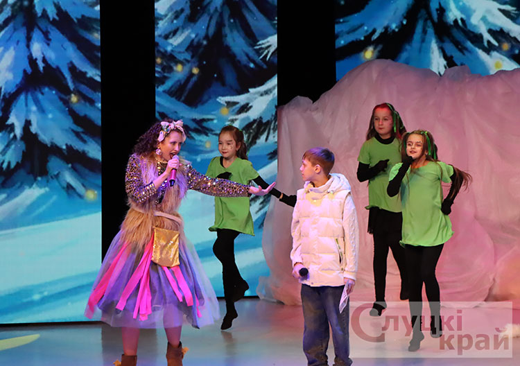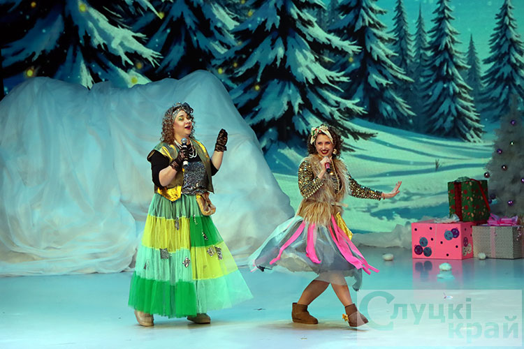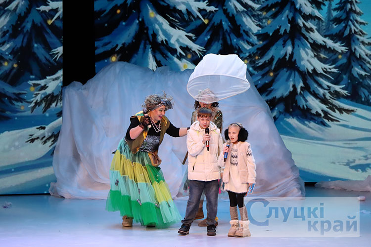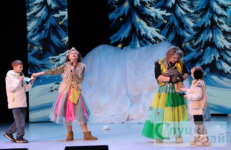 Затем для гостей праздника прошло театрализованное представление. Волшебная сказка ожила сцене. Вместе с главными героями сказки Снегурочкой и ее помощниками мальчишки и девчонки искали потерявшиеся письма для волшебных новогодних часов Дедушки Мороза, которые пытались украсть злой волшебник Шкрундель Шкрепс и кукла Урсула.