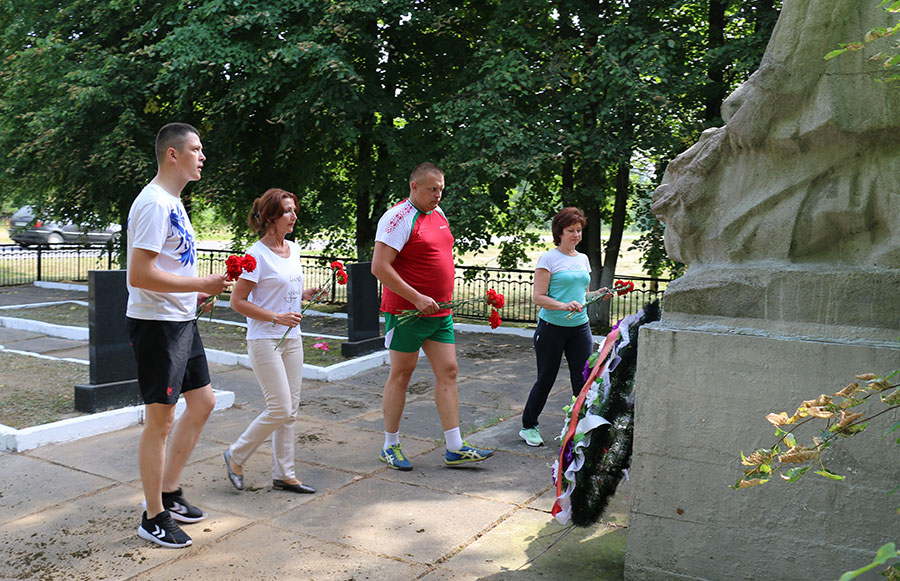 По ходу движения к братской могиле 254-м партизанам бригад им. Суворова, им. Фрунзе, павшим в борьбе с немецко-фашистскими оккупантами в 1941 – 1944 гг., расположенной недалеко от д. Поликаровка, председатель райисполкома Андрей Янчевский, его заместители Наталья Чернушевич и Александр Хоревич, депутат Палаты представителей Национального собрания Республики Беларусь Валентина Ражанец возложили цветы.