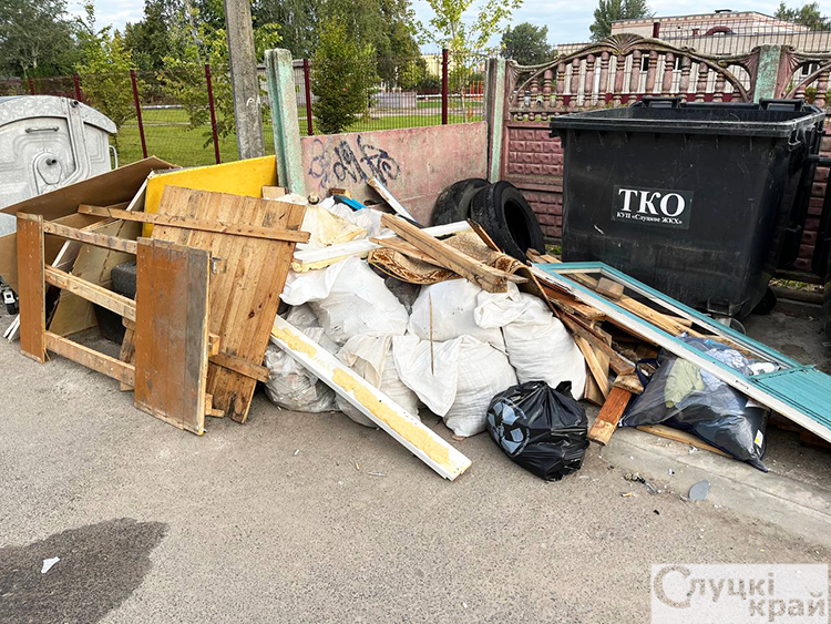 Не лучшим образом выглядит и территория у контейнерной площадки в одном из жилых дворов Слуцка по улице Жукова. Старые двери, раковины, тумбы… Понятно, что после ремонта в квартире многое стало ненужным. Но не складировать же все это на контейнерную площадку!