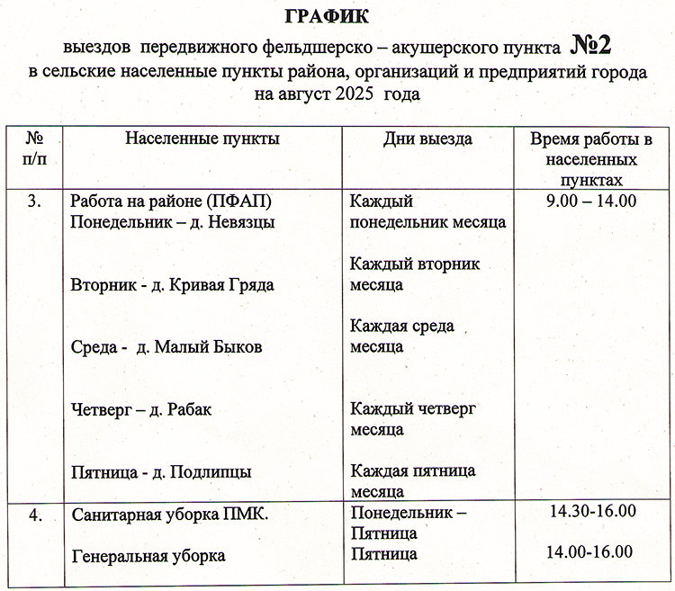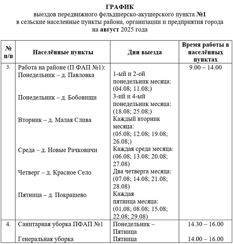 Здоровые города и поселки 0 min read 148 График выездов передвижных фельдшерско-акушерских пунктов в сельские населенные пункты района, организации и предприятия города в августе СК 1 августа, 2025 0 По информации УЗ “Слуцкая ЦРБ”.