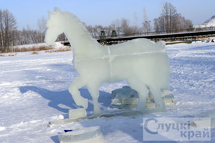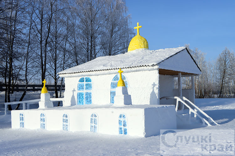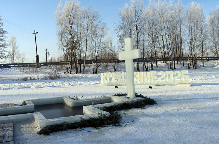 Военнослужащие 30-ой отдельной железнодорожной бригады постарались на славу. К купели ведут деревянные настилы, сама прорубь вырублена в форме креста, обложена по контуру ледяными глыбами. Впечатляют и вырубленные изо льда крест, слово «Крещение 2026» и символ года – лошадь. Создает праздничное настроение и снежная церковь.