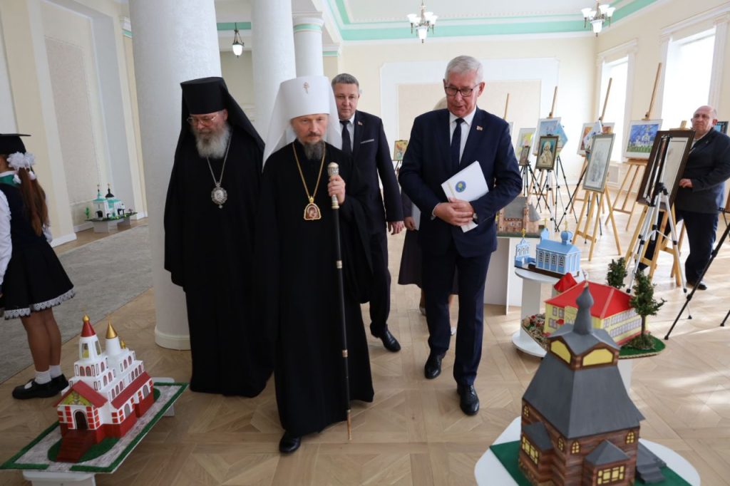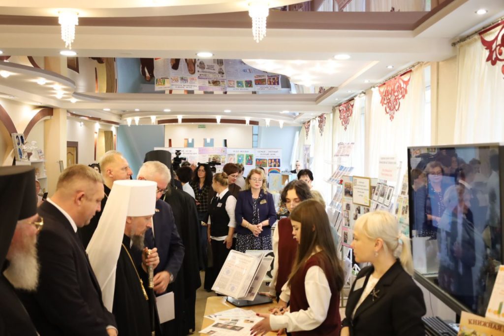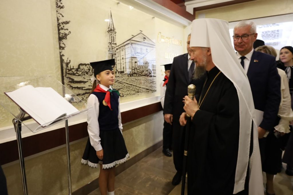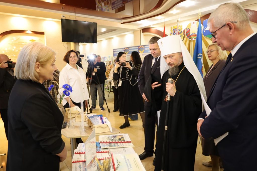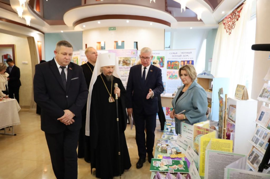 Митрополит Минский и Заславский Вениамин, Патриарший Экзарх всея Беларуси, начальник главного управления идеологической работы и по делам молодежи Минского облисполкома Ольга Топдемир, начальник главного управления по образованию Минского облисполкома Николай Башко, председатель Слуцкого райисполкома Владимир Гога ознакомились с работой интерактивной выставки «Духовно-нравственное воспитание: опыт работы учреждений образования Минской области».