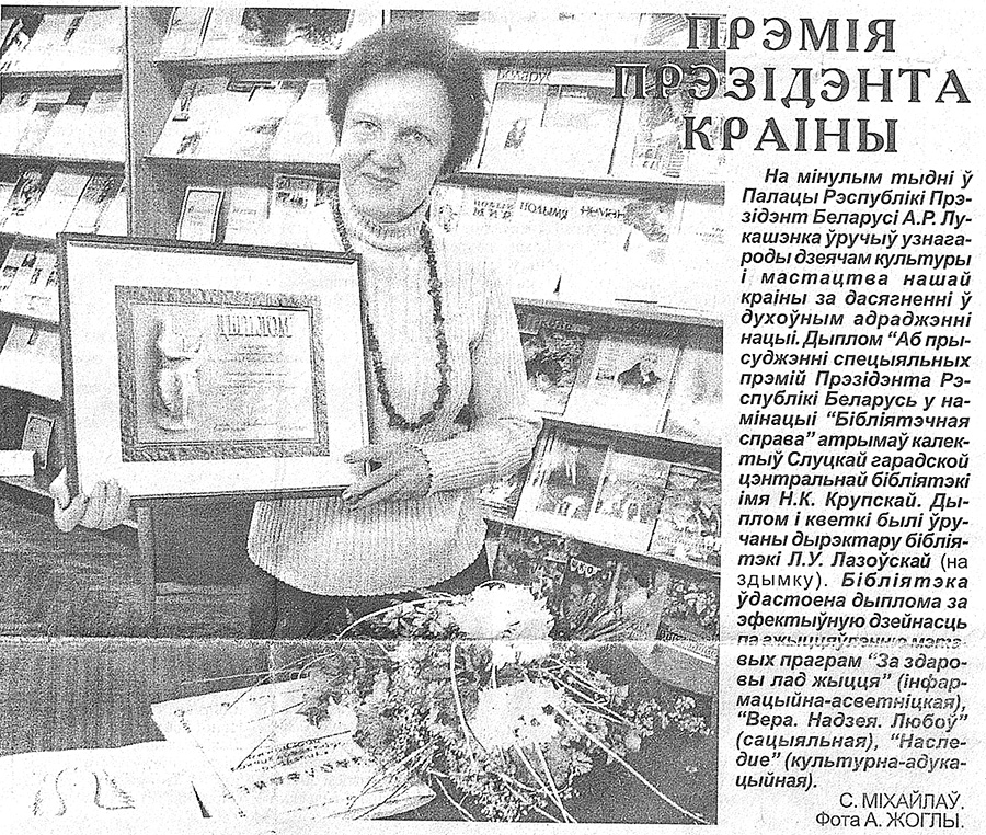 – Мне всегда везло с коллективом. Люди, которые работали со мной, и сотрудники, трудящиеся в библиотеке сегодня, – команда единомышленников, имеющих высокий профессиональный уровень, – отмечает Людмила Владимировна. – Сейчас Слуцкой районной центральной библиотекой руководит Людмила Васильевна Гуринович. Она чудесный человек и профессионал своего дела. Отрадно видеть, как продолжая славные традиции, коллектив библиотеки реализует новые проекты, внедряя свою «изюминку» и частичку души.