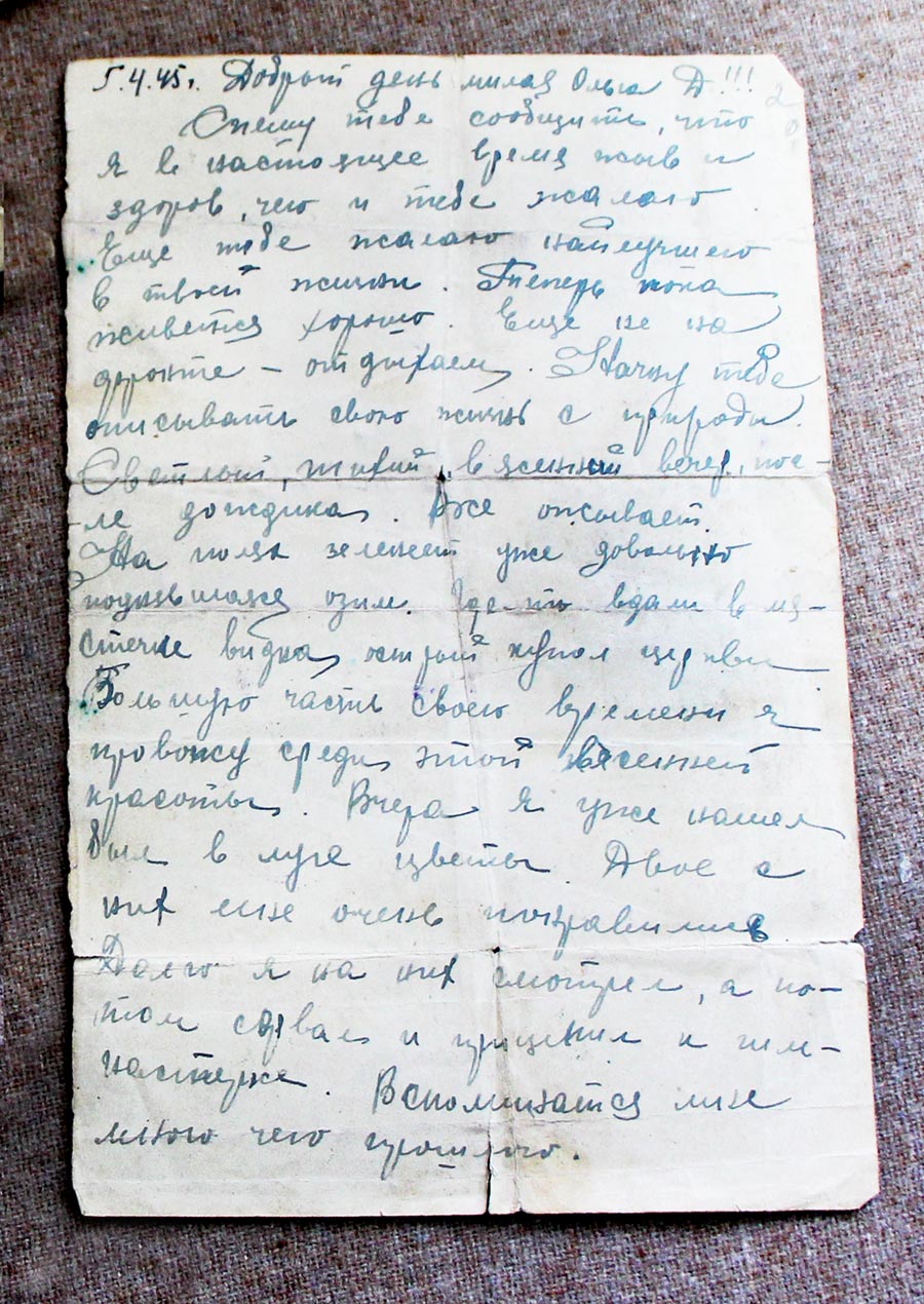 Здравствуй, милая Ольга Д. В начальных строках своего письма спешу тебе сообщить, что я в настоящее время жив и здоров, чего и тебе желаю. Оля, я скоро опять уезжаю на фронт. Когда точно, не могу сказать, приблизительно к концу этого месяца будем бить немца во всю. Оля, пиши, там, в бою, сердце примет твои слова, станет еще тверже и сильней. Оля, я пишу тебе почти каждый день. И покуда есть возможность, буду писать. Не забыть мне тебя, покуда сердце бьется, оно не даст покоя руке, которая пишет его послания. Я предполагаю, после каждого моего письма у тебя не высыхают слезы… Я это прекрасно знаю. Этого я не желал бы, Оля, верь, останусь жив, вместо слез будет встреча. Будет жизнь и любовь. До свидания, дорогая жена Ольга Д.