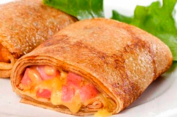 Ветчину нарежьте соломкой, сыр натрите на терке. Выложить начинку на блин. Заверните конвертиком и обжарьте с двух сторон.