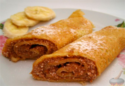 Можно украсить блины кусочками бананов, посыпать сахарной пудрой или полить соусом.