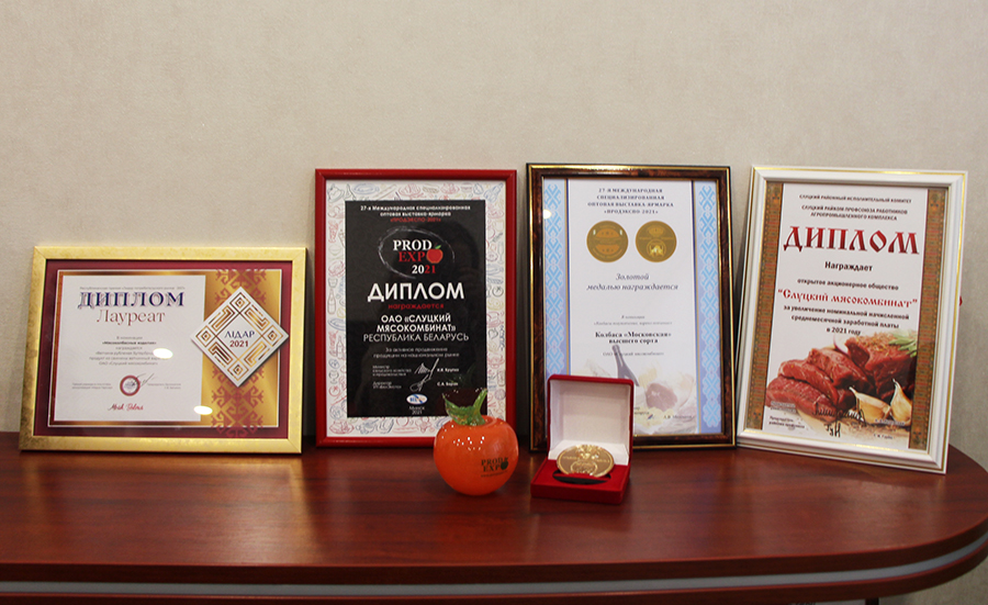 Удостоена диплома продукция Слуцкого мясокомбината и по результатам престижной ежегодной Премии потребительского признания «Народная марка», диплома лауреата – по итогам республиканской премии «Лидер потребительского рынка – 2021» в номинации «мясоколбасные изделия» за ковалочек «Оригинальный» и ветчину рубленую «Бутербродную», «варено-копченое колбасное изделие мясное».