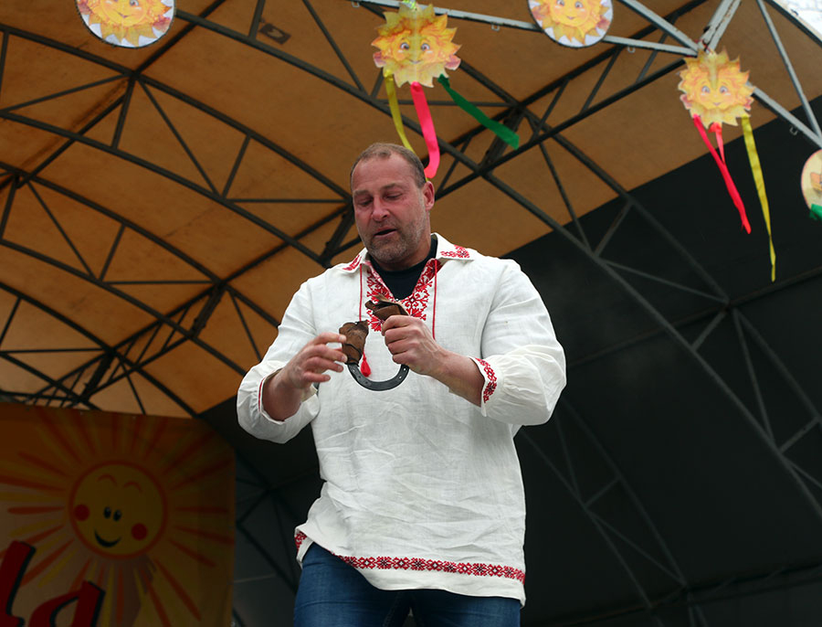 Своими умениями в силовом шоу удивил гостей праздника настоящий белорусский богатырь. Шутка ли голыми руками согнуть сковородку, или лошадиную подкову.