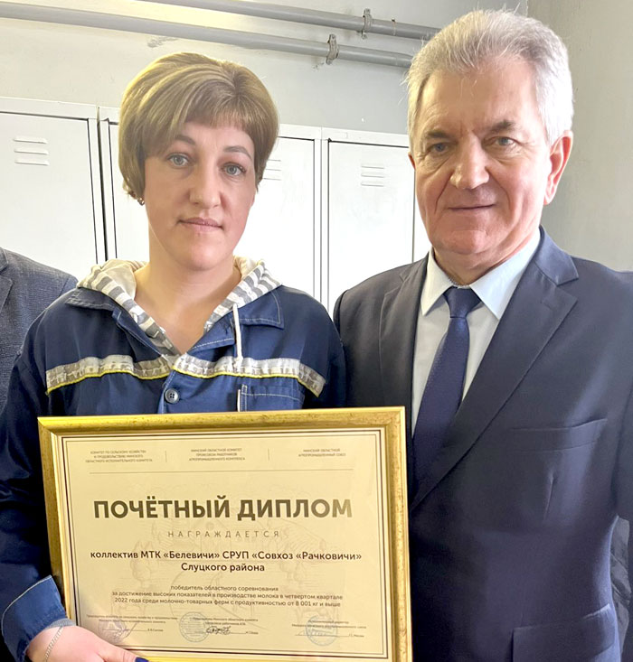 По итогам областного соревнования за достижение высоких показателей в производстве молока за четвертый квартал 2022 года МТК «Белевичи» государственного предприятия «Совхоз «Рачковичи» среди молочно-товарных ферм (комплексов) с продуктивностью молочного стада за предыдущий год от 8 001 кг на 1 корову занял первое место в Минской области.