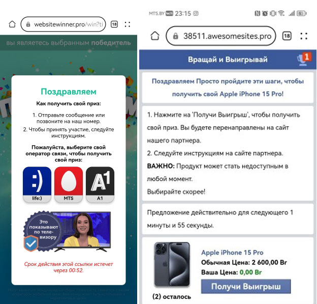 И далее при нажатии ссылки появляется текст «Поздравляем! У вас есть шанс выиграть подарок. Нажмите кнопку «Получить подарок», чтобы продолжить».