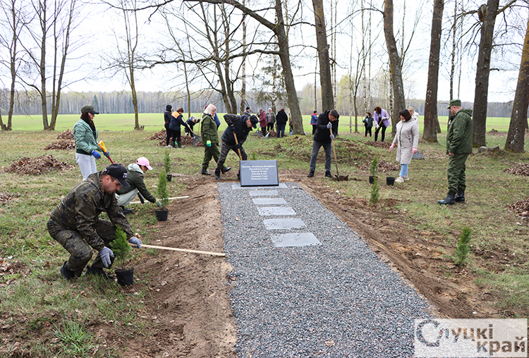 Председатель Слуцкого райисполкома Владимир Гога, председатель Слуцкого районного Совета депутатов Александр Курак, депутат Палаты представителей Национального собрания Республики Беларусь Наталья Овсянникова, а также заместители председателя, работники райисполкома, представители учреждений образования и ЛТП№3 заняты на благоустройстве мемориала на месте сожженной в годы Великой Отечественной войны деревни Переходы.