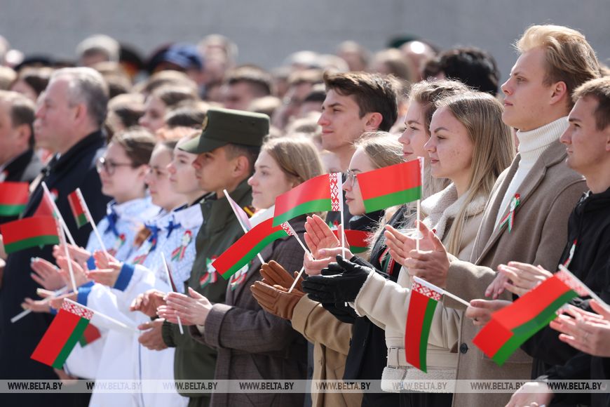 Премьер-министр Александр Турчин поздравил белорусов с Днем Государственного флага, Государственного герба и Государственного гимна во время торжественного ритуала чествования госсимволов Беларуси на площади Государственного флага в Минске.