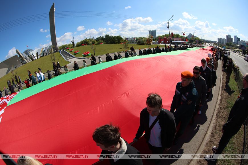 Шествие с самым большим флагом Беларуси стартовало от стелы “Минск – город-герой”.