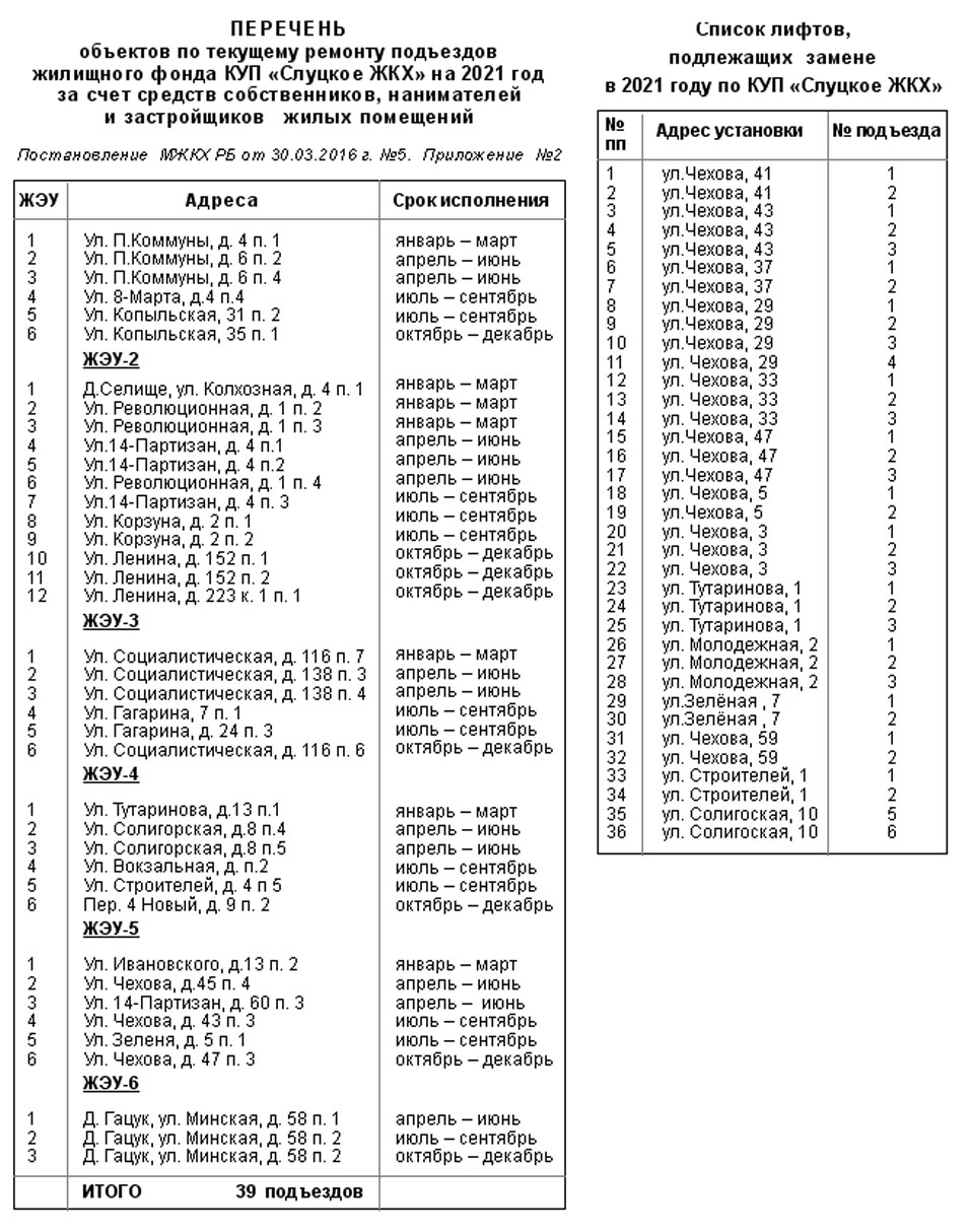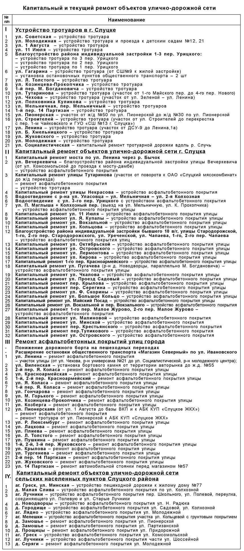 Дополнение в перечень очередности выполнения работ по капитальному ремонту объектов улично-дорожной сети г. Слуцка: