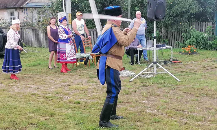 На площадке прозвучали и веселые песни, и задорные истории. Был и эффектный номер с фланкировкой шашкой — момент, когда взрослые восхищенно замирали, а дети не могли отвести глаз. Не обошлось и без народного хорового пения — когда уже трудно различить, где сцена, а где зрители. Так деревня стала единым хором.