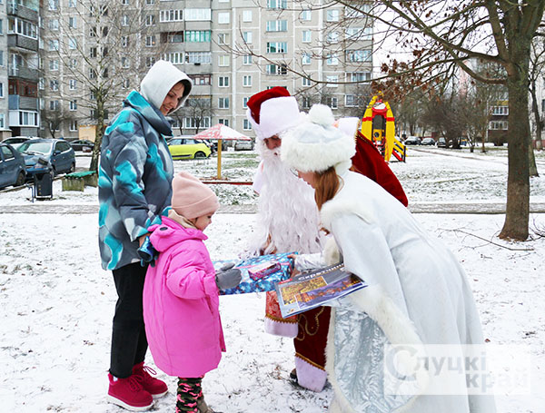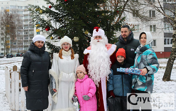 Гости подарили детям не только игры, но и сладкие подарки, с удовольствием послушали новогоднюю песенку в исполнении Тимура. На память о чудесной встрече сделали совместное фото возле красавицы-елки, что установлена в их дворе.