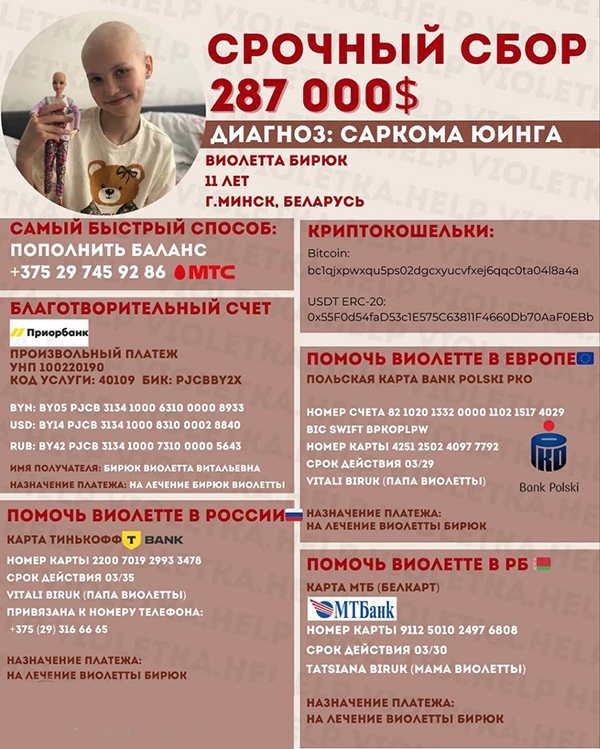 Наша семья просит от всего сердца поддержать Виолетту на пути к её выздоровлению любым из способов, посильной и приемлемой помощью.