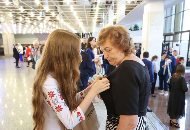 Глава государства заметил, что каждый советский воин вел священную войну за будущее огромной страны – от Бреста до Владивостока, от Мурманска до Ташкента. “Вел ее здесь, в Беларуси, – сказал он. – Беларусь помнит героев. Имена многих уроженцев братских республик увековечены в названиях улиц наших городов и сел. В их честь и славу под Минском воздвигнут курган, земля для которого собрана со всех уголков Советского Союза. Великий по своему замыслу, он возвышается как символ советского народа – народа-победителя”.