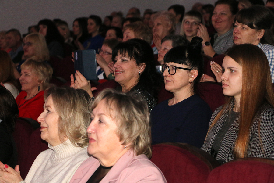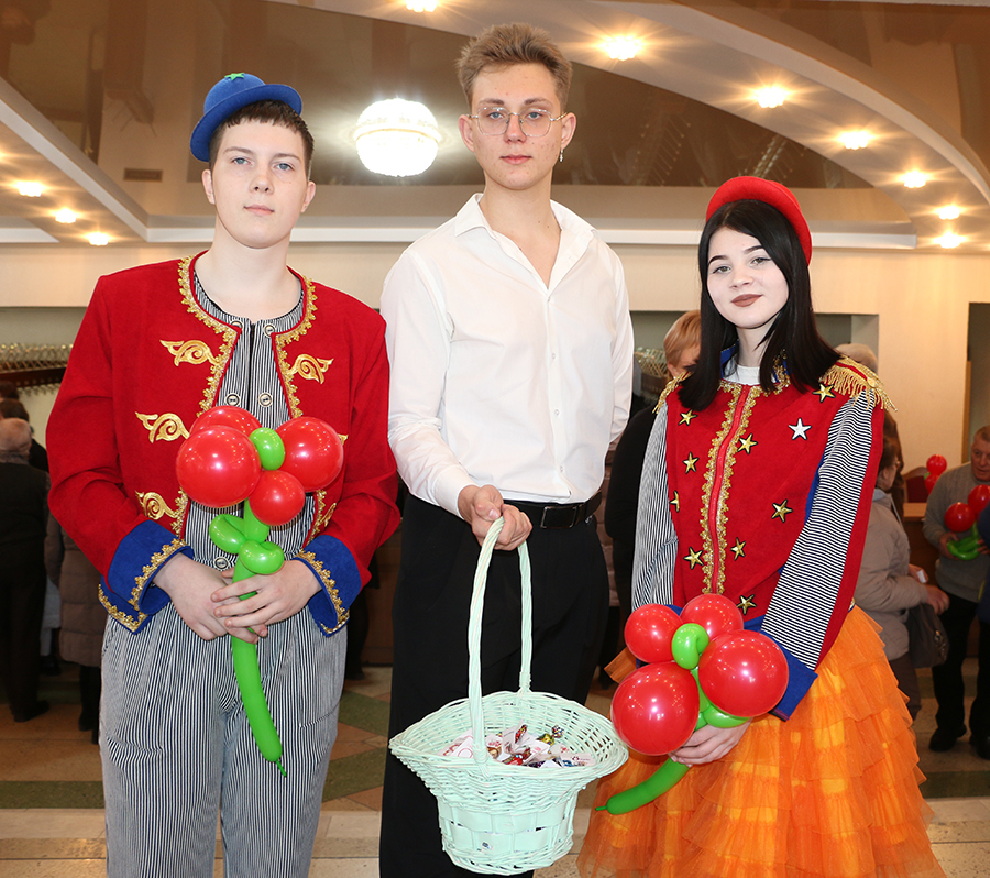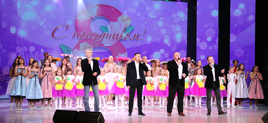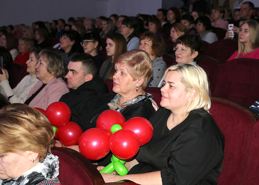 В городском Доме культуры состоялось торжество, посвященное Дню женщин. Еще до начала праздничного концерта в холле Дома культуры царила атмосфера тепла, улыбок и хорошего настроения. Волонтеры БРСМ поздравляли милых женщин, предлагали угоститься конфетами с пожеланиями, дарили цветы из воздушных шаров. Работали тематические фотозоны, выставки. Особое лирическое настроение создавали звуки саксофона в исполнении Вячеслава Рахманова.