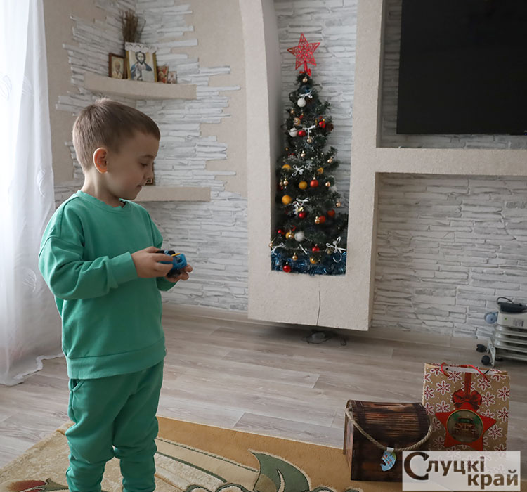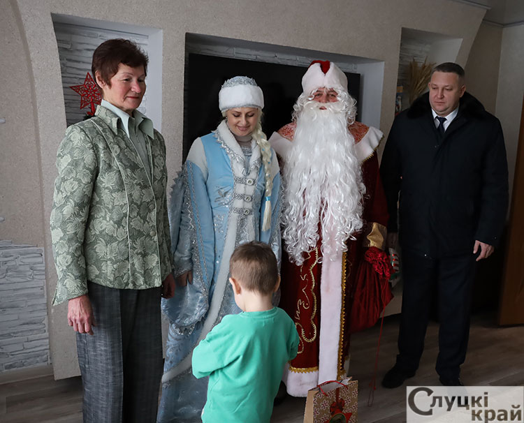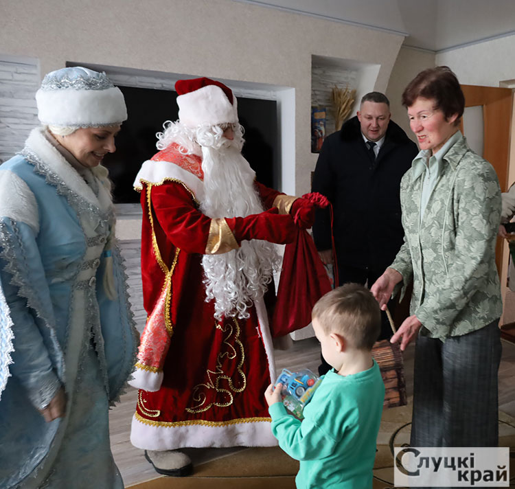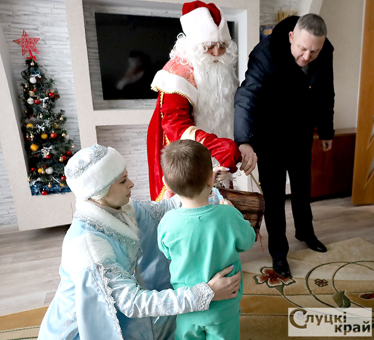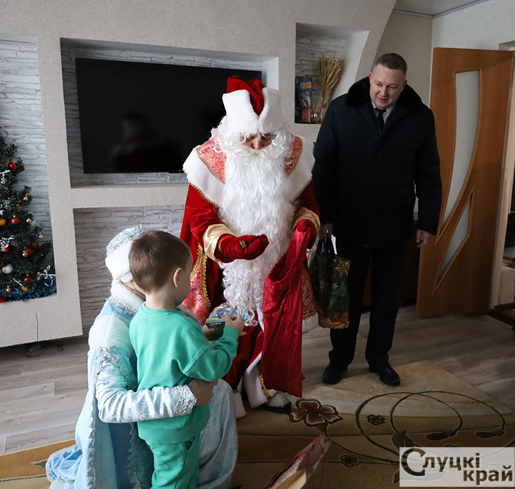 Продолжается районная благотворительная акция “Елочка желаний”. Председатель Слуцкого райисполкома Владимир Гога вместе с Дедом Морозом и Снегурочкой привез в подарок маленькому слутчанину Кириллу Сасиновичу игрушечный трактор. Особенность мечты мальчика в том, что трактор обязательно должен быть синего цвета. Даже новогодний венок на входной двери в доме, где проживает Кирилл, был украшен изображениями трактора.