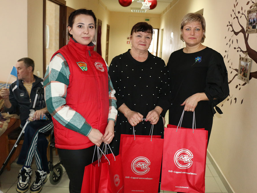 А еще в это день от районной организации Белорусского фонда мира, Слуцкого мясокомбината принимали подарки и поздравления с наступающим Новым годам и Рождеством постояльцы  отделения круглосуточного пребывания для граждан пожилого возраста и инвалидов Слуцкого ТЦСОН. Встреча прошла, как и положено, с участием Деда Мороза, Снегурочки, с песнями и танцами. Настоящий новогодний подарок!