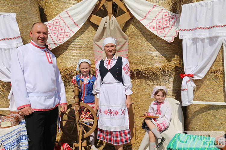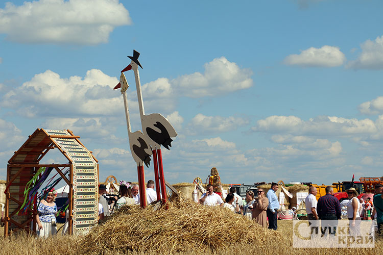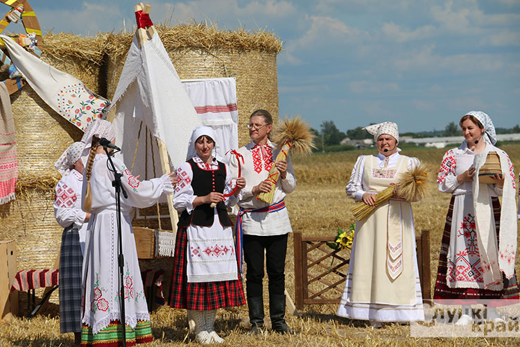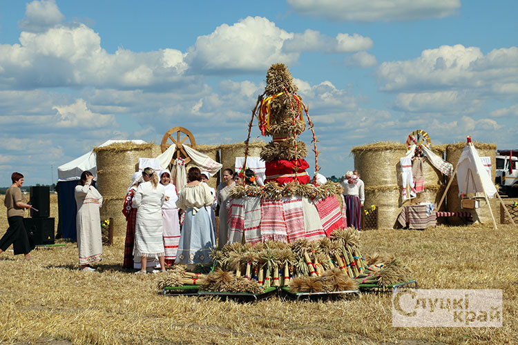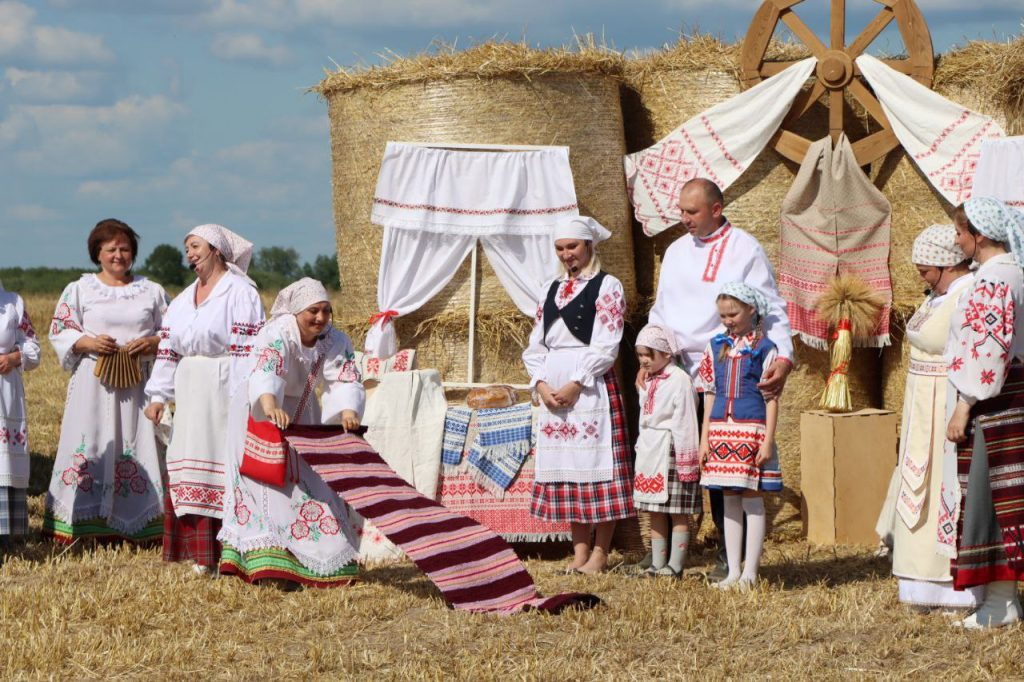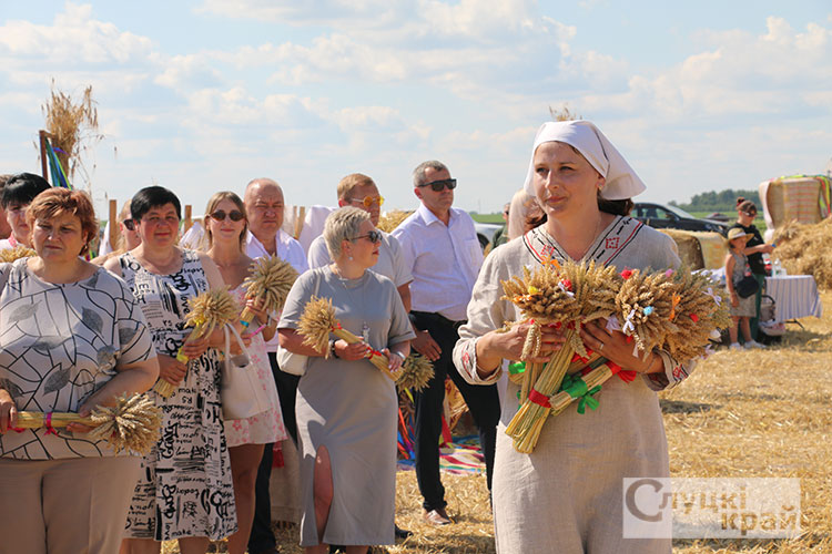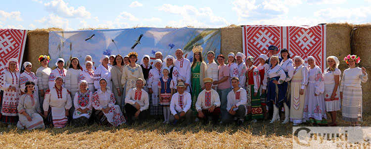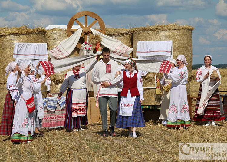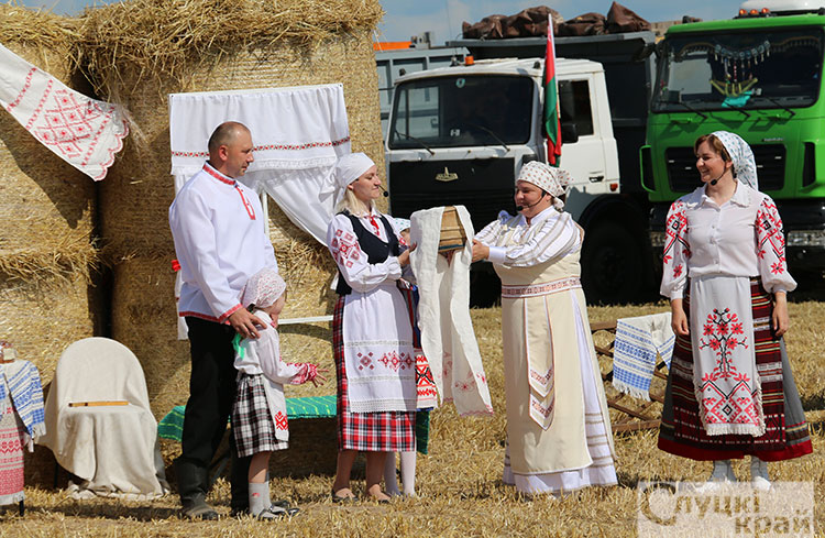 В Слуцком районе существует обычай, когда в день жатвы снопы первого урожая приносят в дома, где происходили значимые события. Участникам торжества показали постановочное обрядовое действие «Снопы в три дома».