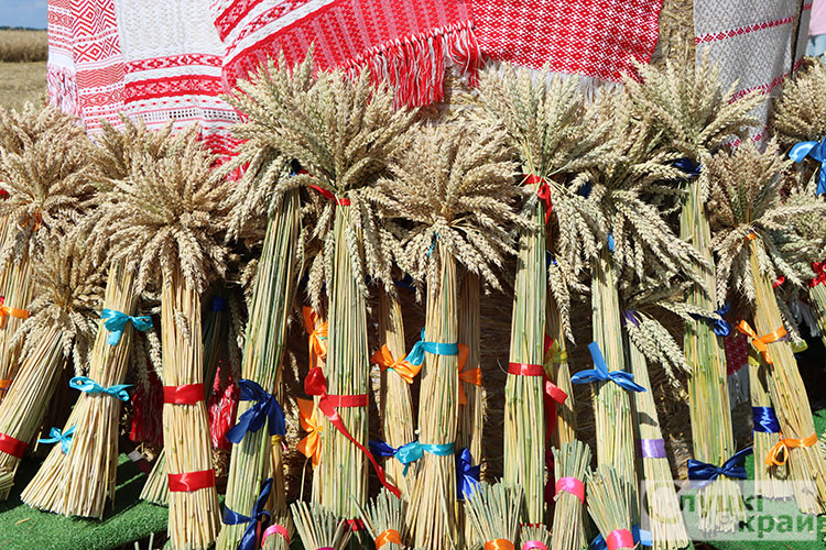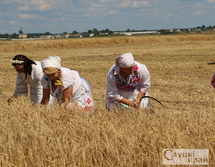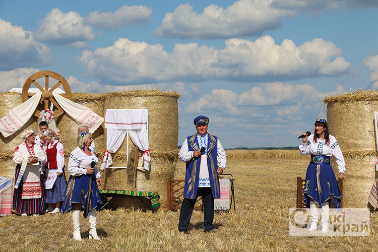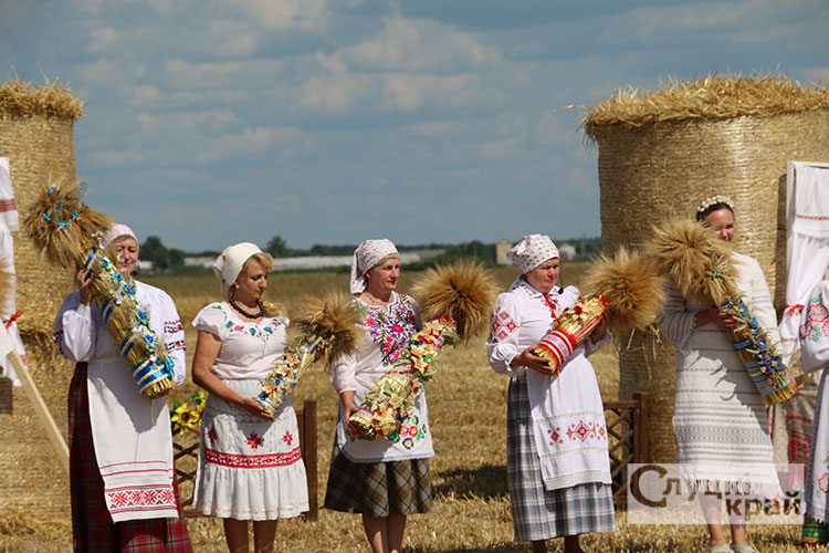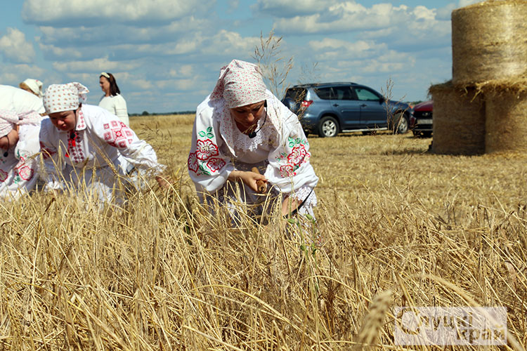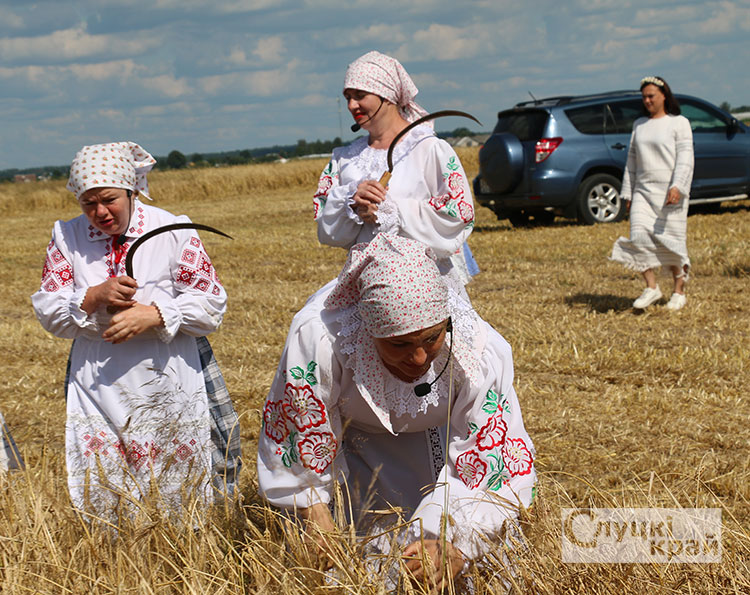 Уже давно зерновые на полях убирают комбайны, но по традиции женщины в национальных костюмах с песнями зажинают серпами первые снопы.