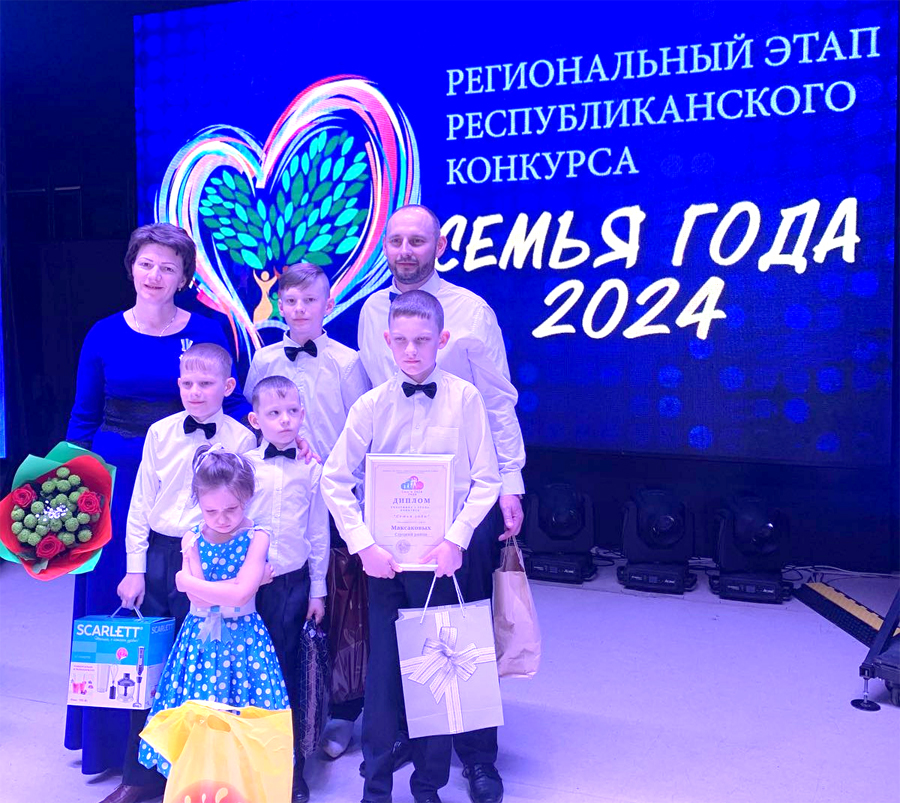 В Дзержинске прошел зональный этап республиканского конкурса «Семья года». В нем приняли участие 13 многодетных семей Минщины. Наш район представляла семья Максаковых – Екатерина, Александр и их сыновья Александр, Кирилл, Андрей, Михаил и дочь Амелия.