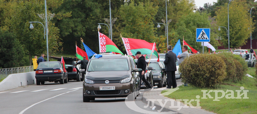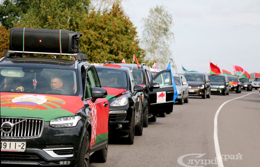 К автомобилям «Патриотов Беларуси» присоединились представители Слуцкого района с государственными символами и флагами, и вместе они отправились в соседний район.