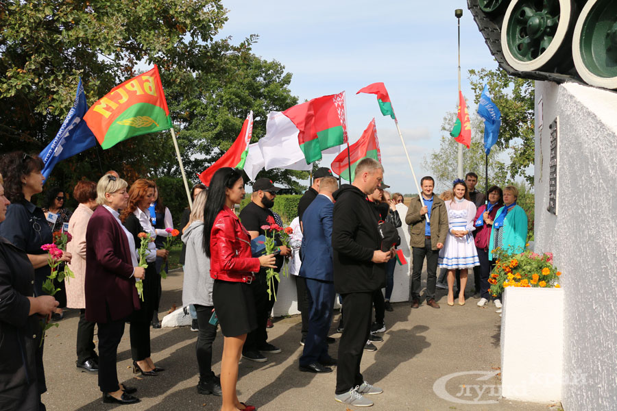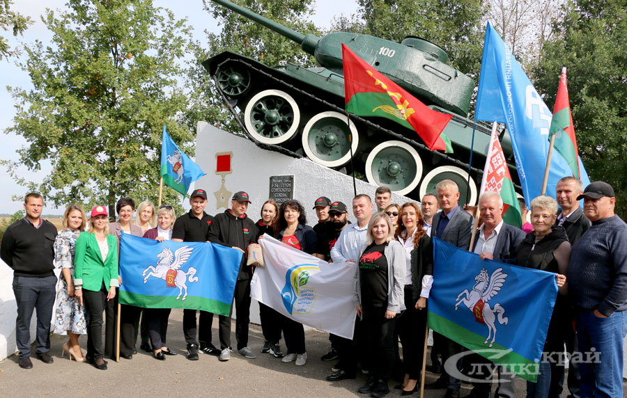 На развилке дорог в Погосте, где установлен танк Т-34, автоколонну встретили солигорчане. У монумента прошел памятный митинг, возложили цветы. Кстати, на боковой грани постамента с танком символическое изображение Звезды Героя Советского Союза и табличка с надписью: «Экипажу танка Т-34 Героя Советского Союза Н.А. Зиновьева, совершившему героический подвиг при захвате переправы через р. Случь 30 июня 1944 г.».