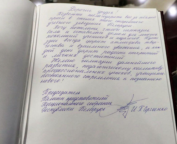 “Уникальное учебное заведение. И самое приятное – видеть таких подтянутых ребят, которые знают историю и увлечены ее изучением”, – сказал председатель Палаты представителей, подчеркнув, что гимназия – образец для всей системы образования.