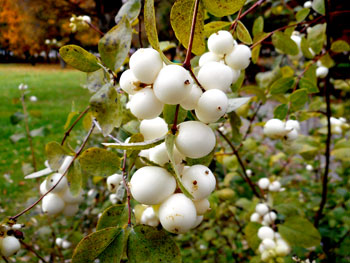 Весной и летом никто не обратит внимания на этот невысокий кустарник, но с приходом первых заморозков снежноягодник скрашивает серые тона парков и скверов. Словно выпал первый снег, и восковидные ягодки буквально светятся в тени окружающих деревьев. А мякоть сочных плодов и в самом деле похожа на искрящиеся снежинки. Жемчужные связки белых гроздей смотрятся как снежные хлопья, чудесным образом прилетевшие в дремотные осенние кущи. Когда веточки под тяжестью плодов грациозно склоняются к земле, то издалека куст напоминает маленький белоснежный фонтан.