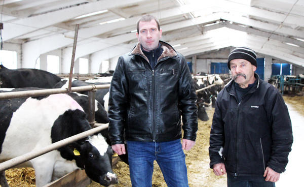 Сергей Игоревич Лещенко, слесарь молочно-товарного комплекса МТФ №1 (д. Покрашево), пришел в хозяйство в 2007 году на практику и остался тут работать. Он отец троих дочерей, две из которых близняшки. Александр Михайлович Березовский, ветеринарный фельдшер, работает в филиале с 1988 года.