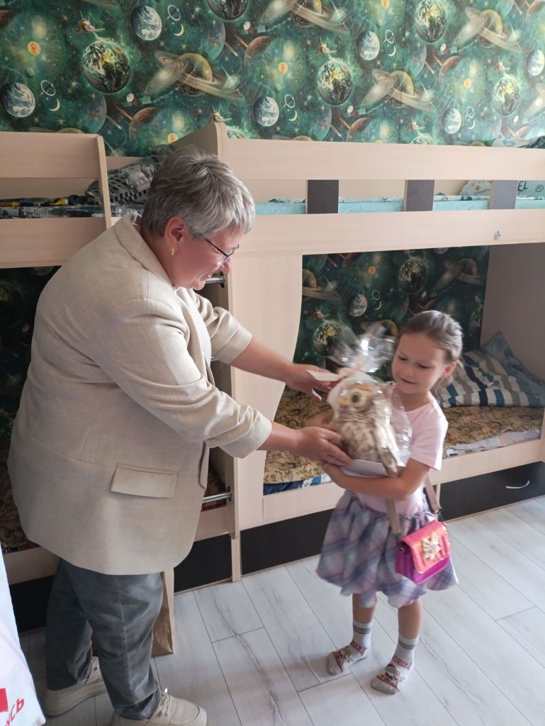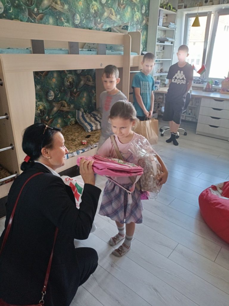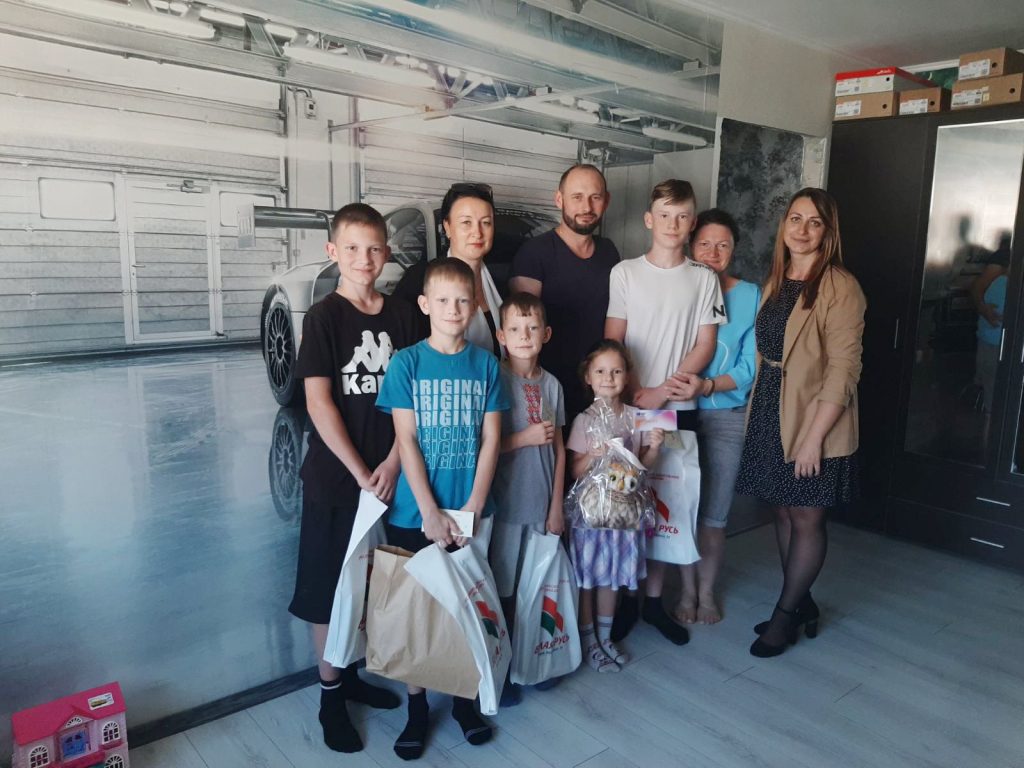 В рамках республиканской благотворительной акции «Соберем портфель первокласснику» поздравления и подарки к новому учебному году принимала первоклассница Амелия из многодетной семьи Максаковых в Слуцке.