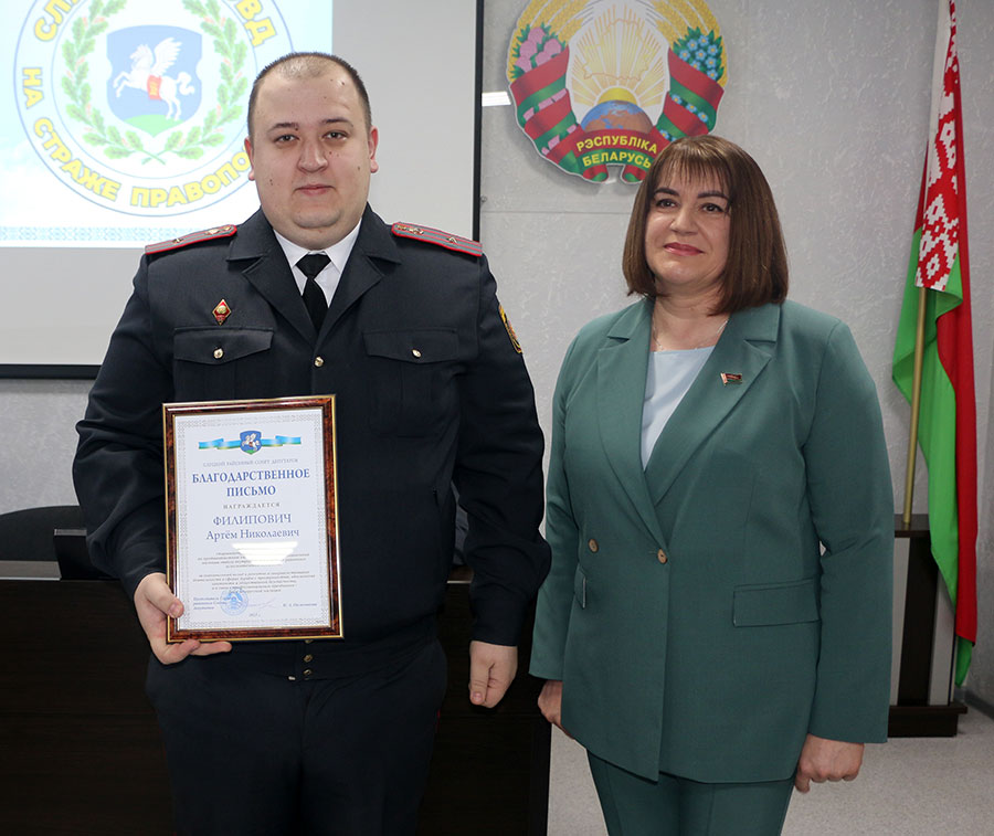 Председатель Слуцкого районного Совета депутатов Наталья Овсянникова отметила, что профессия милиционера подразумевает не только высокую ответственность, но и такие понятия как доблесть, порядочность, честь. Наталья Александровна подчеркнула, что районный Совет депутатов активно взаимодействует со Слуцким РОВД по различным вопросам, не раз на практике убеждались в компетентности, мобильности слуцких милиционеров. Председатель районного Совета депутатов поздравила сотрудников РОВД с профессиональным праздником, пожелала добра, мира, успешной службы.