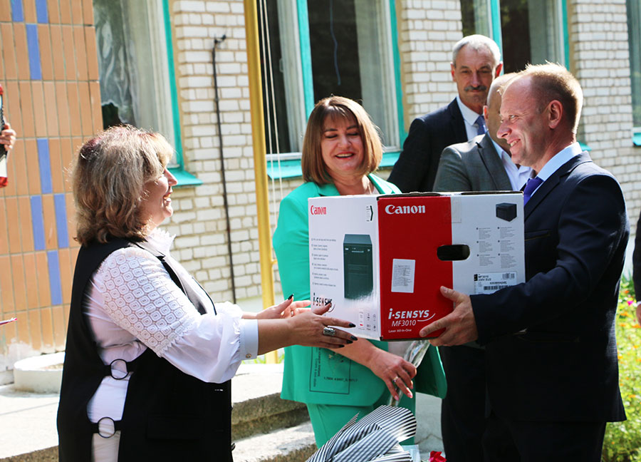 Гости приехали на линейку не с пустыми руками. Для улучшения материально-технической базы учреждению образования передан новый принтер.