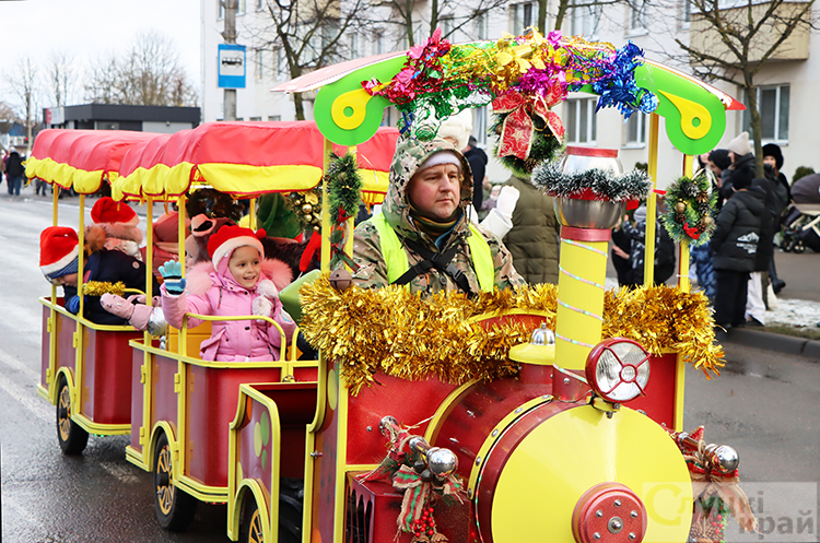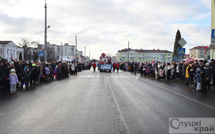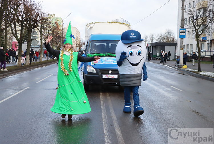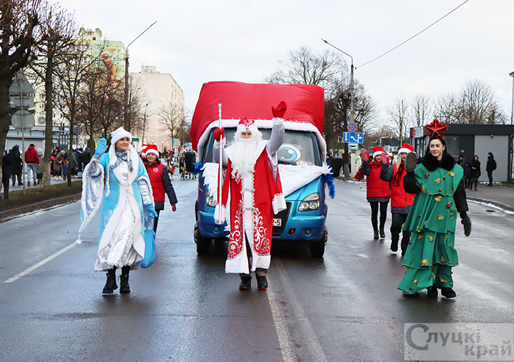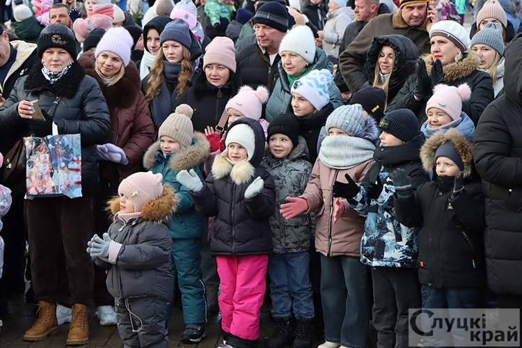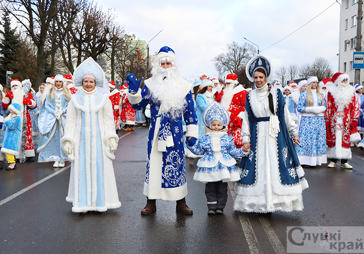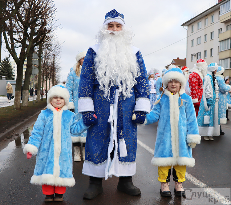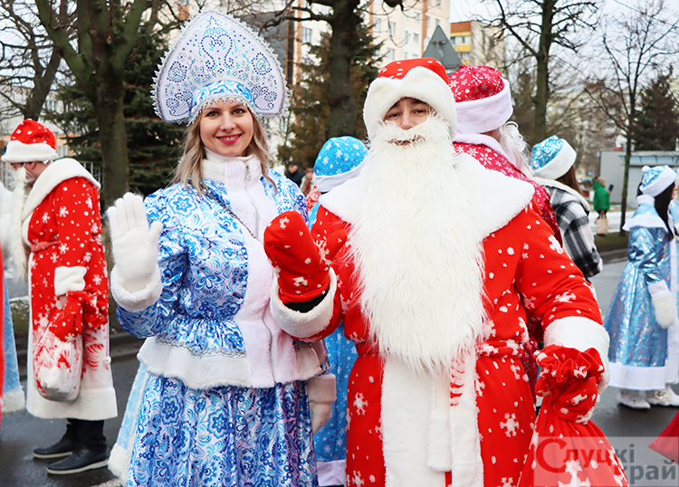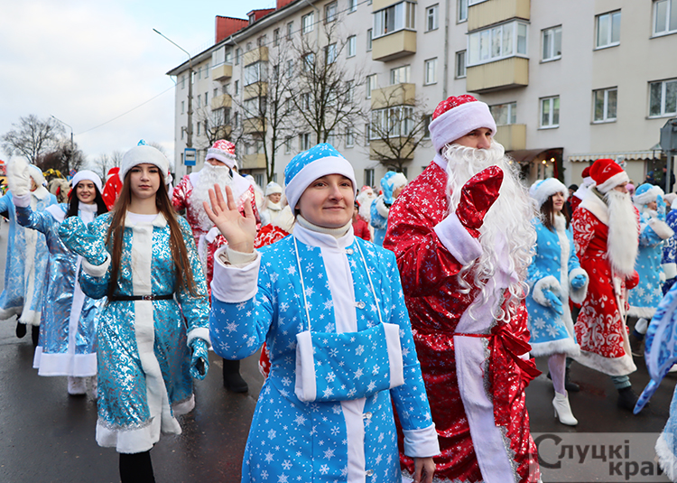 И вот, под звуки образцового духового оркестра Слуцкой детской школы искусств, колонна двинулась навстречу празднику. Дедушки Морозы и Снегурочки, нарядные елочки, герои мультфильмов и другие персонажи приветствовали слутчан и гостей города.